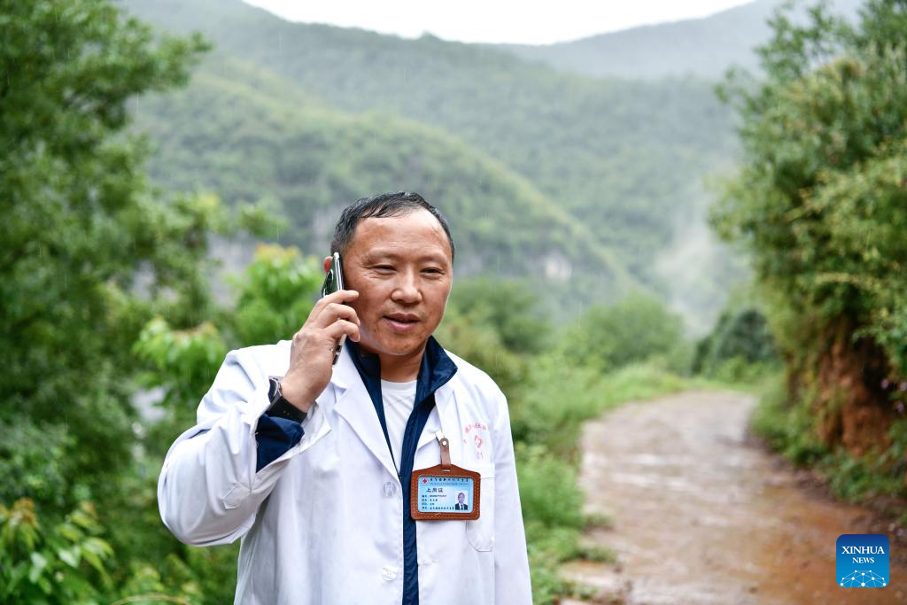 Zhu Daqing answers the phone on his way to a patient in Xinshui Village, Mazha Town of Yi-Hui-Miao Autonomous County of Weining, southwest China's Guizhou Province, July 19, 2023. (Xinhua/Yang Wenbin)