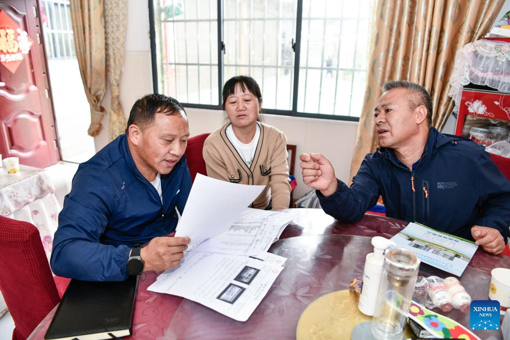 Zhu Daqing (L) checks the medical report of a patient in Xinshui Village, Mazha Town of Yi-Hui-Miao Autonomous County of Weining, southwest China's Guizhou Province, July 19, 2023. (Xinhua/Yang Wenbin)