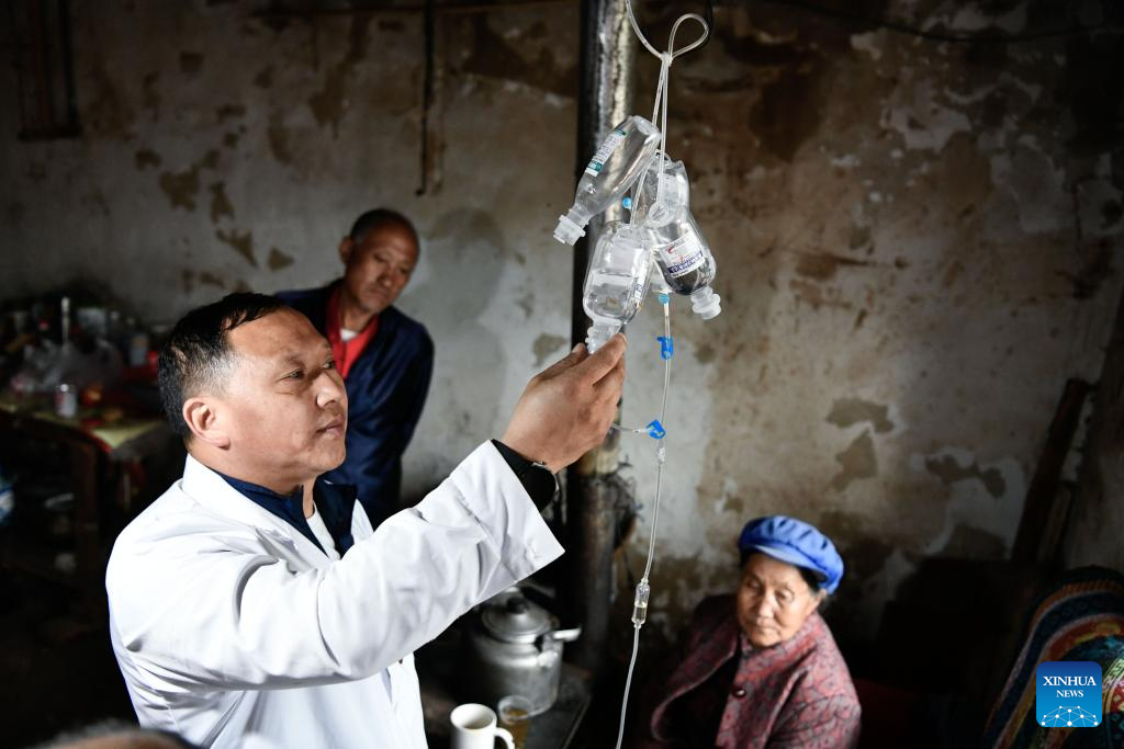 Zhu Daqing administers an intravenous drip to a patient at the patient's house in Xinshui Village, Mazha Town of Yi-Hui-Miao Autonomous County of Weining, southwest China's Guizhou Province, July 19, 2023. (Xinhua/Yang Wenbin)