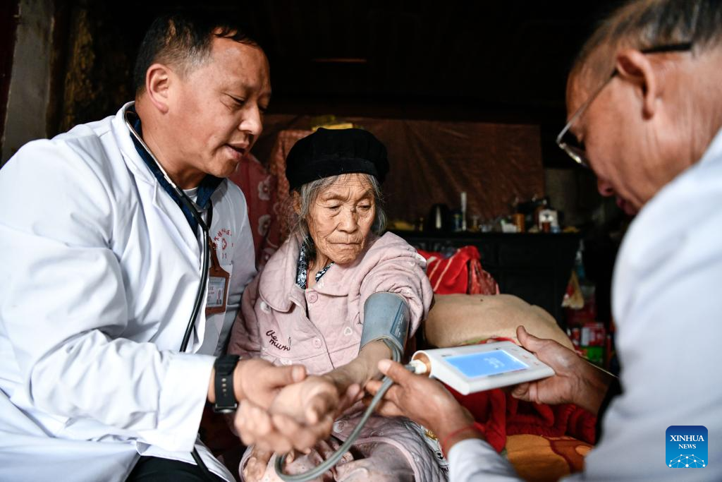 Zhu Daqing (L) and another doctor measure blood pressure of an elderly patient at the patient's house in Xinshui Village, Mazha Town of Yi-Hui-Miao Autonomous County of Weining, southwest China's Guizhou Province, July 19, 2023. (Xinhua/Yang Wenbin)