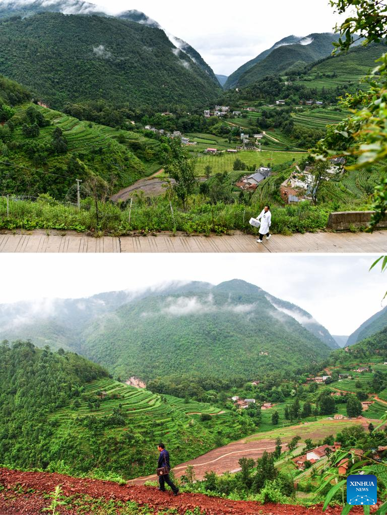 This combo photo shows Zhu Daqing walking on a flat concrete road on his way to a patient in Xinshui Village, Mazha Town of Yi-Hui-Miao Autonomous County of Weining, southwest China's Guizhou Province, July 19, 2023 (above) and Zhu Daqing walking on an unsurfaced road on his way to a patient in Xinshui Village, Mazha Town of Yi-Hui-Miao Autonomous County of Weining, southwest China's Guizhou Province, July 5, 2012 (below). (Xinhua/Yang Wenbin)
