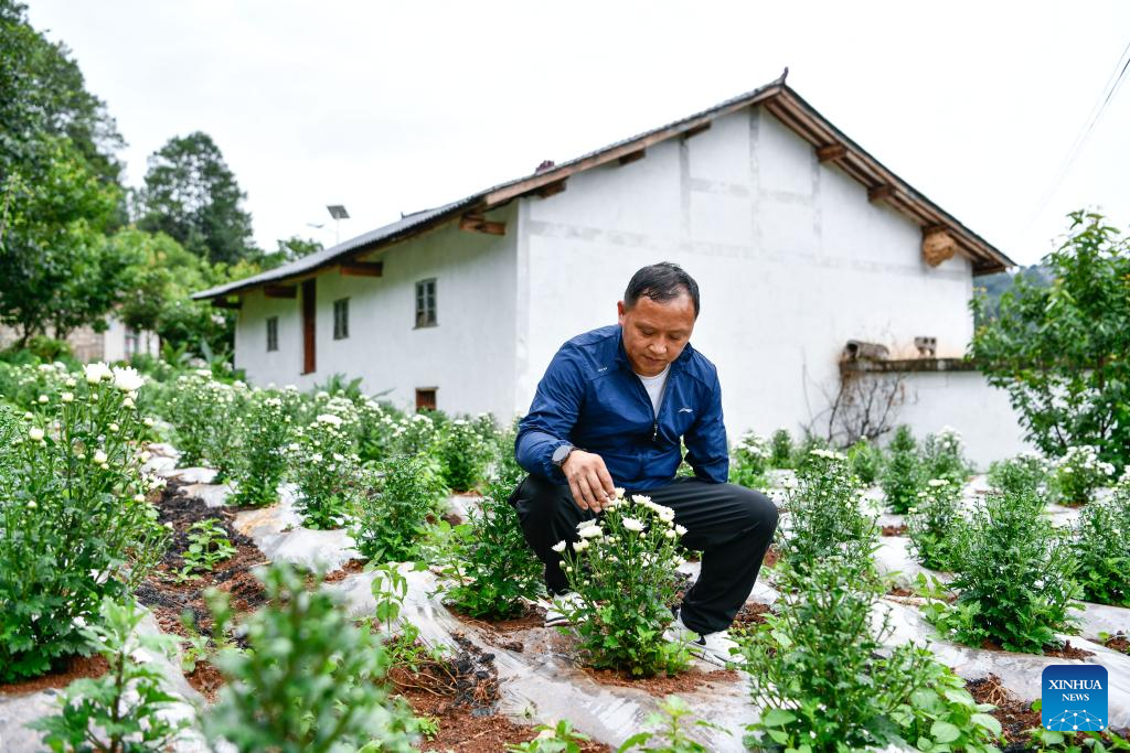 Zhu Daqing checks the chrysanthemums he planted in Xinshui Village, Mazha Town of Yi-Hui-Miao Autonomous County of Weining, southwest China's Guizhou Province, July 19, 2023. (Xinhua/Yang Wenbin)