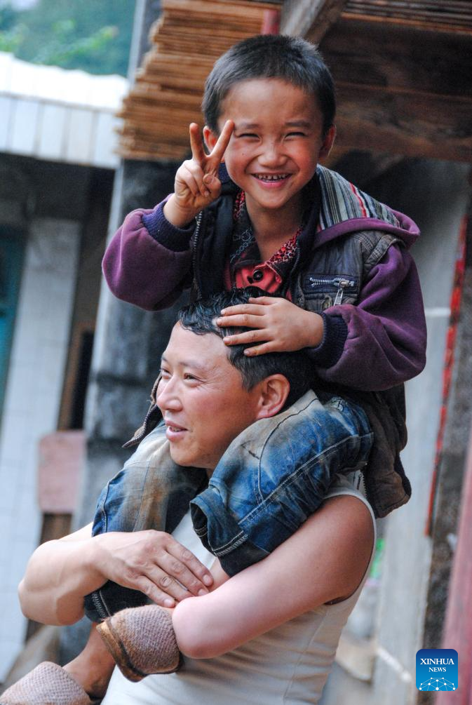 Zhu Daqing plays with his nephew in Xinshui Village, Mazha Town of Yi-Hui-Miao Autonomous County of Weining, southwest China's Guizhou Province, July 4, 2012. Zhu Daqing is a rural doctor in Xinshui Village, Mazha Town of Yi-Hui-Miao Autonomous County of Weining. (Xinhua/Yang Wenbin)