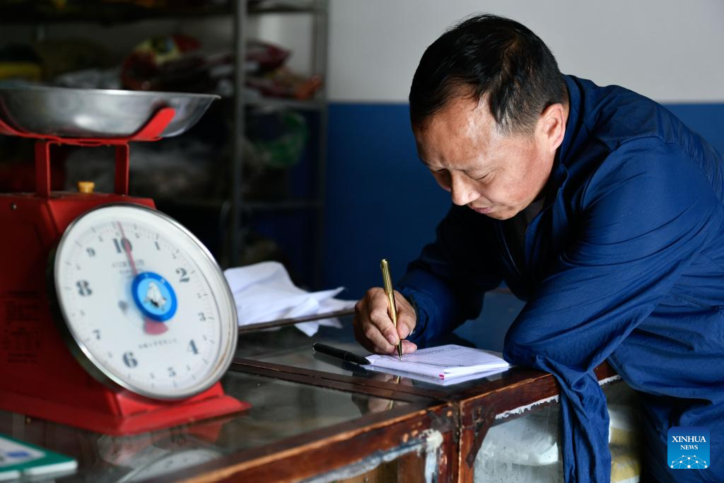 Zhu Daqing writes the medical archive of a patient in Xinshui Village, Mazha Town of Yi-Hui-Miao Autonomous County of Weining, southwest China's Guizhou Province, July 19, 2023. (Xinhua/Yang Wenbin)