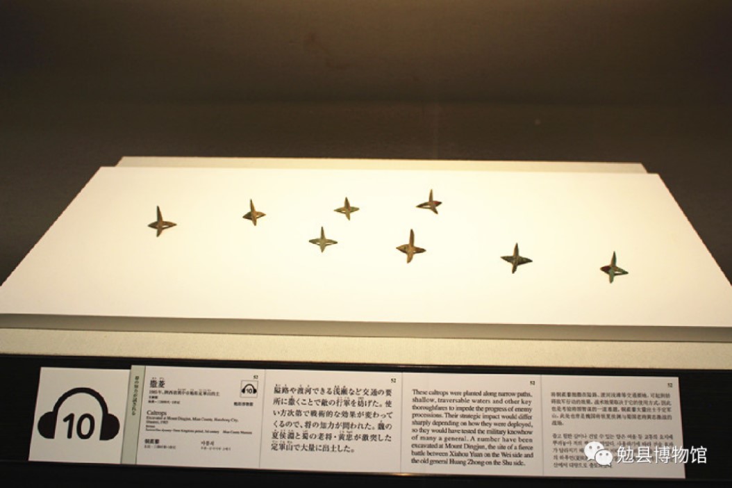 Photo shows bronze caltrops provided by the Mianxian county museum at a Japanese exhibition about the Three Kingdoms in 2019. (Photo from the Mianxian county museum)