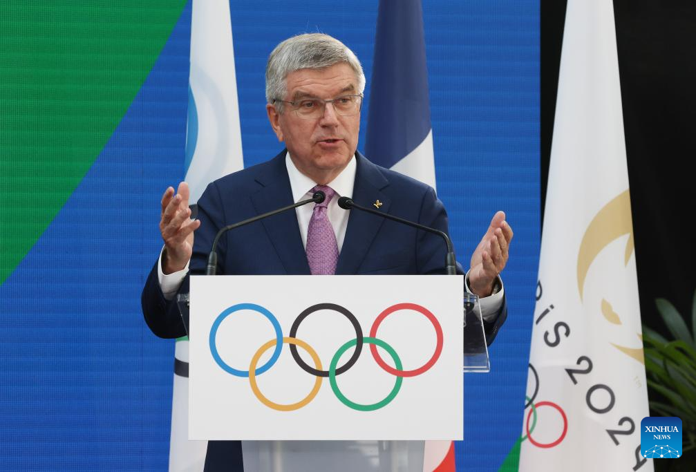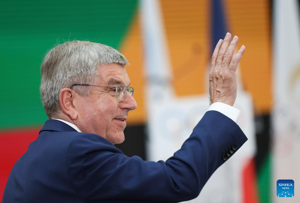 President of the International Olympic Committee (IOC) Thomas Bach attends a ceremony marking one year until the opening ceremony of the Paris Olympics in Saint-Denis, near Paris, France, July 26, 2023. (Xinhua/Gao Jing)