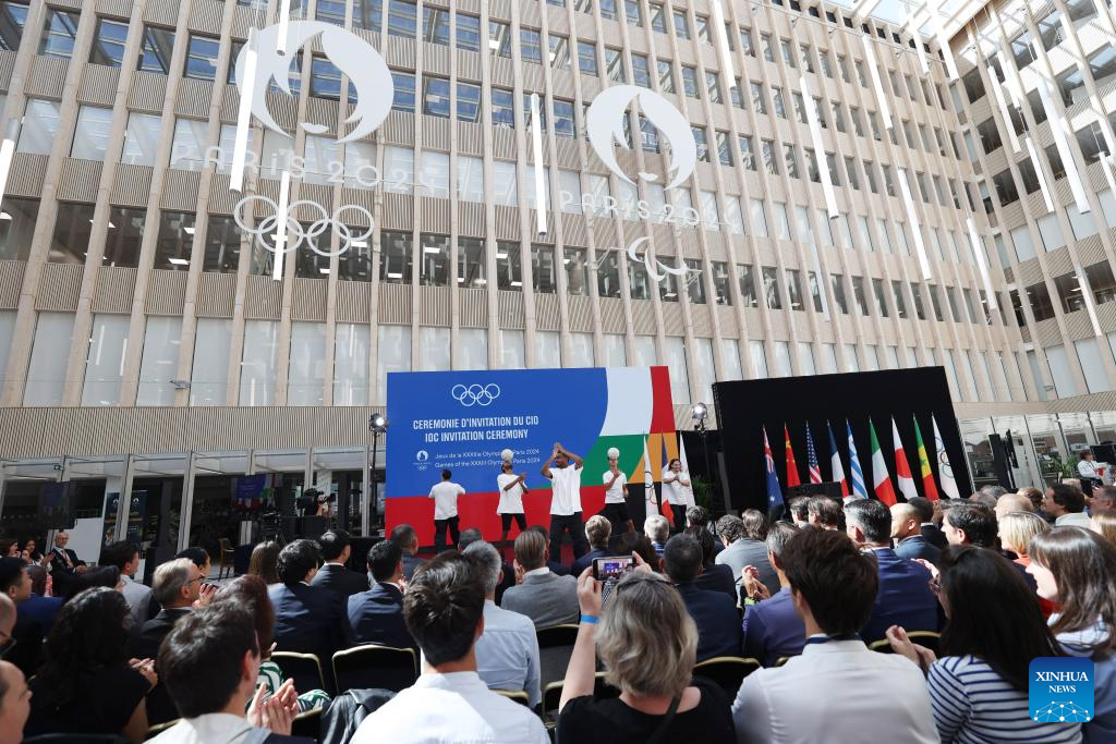 Dancers perform during a ceremony marking one year until the opening ceremony of the Paris Olympics in Saint-Denis, near Paris, France, July 26, 2023. (Xinhua/Gao Jing)