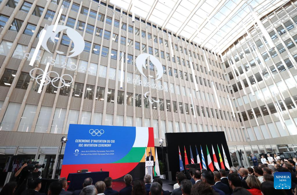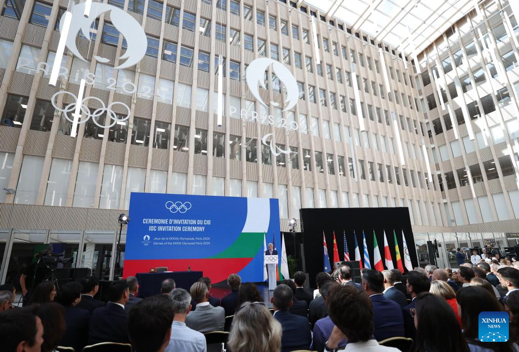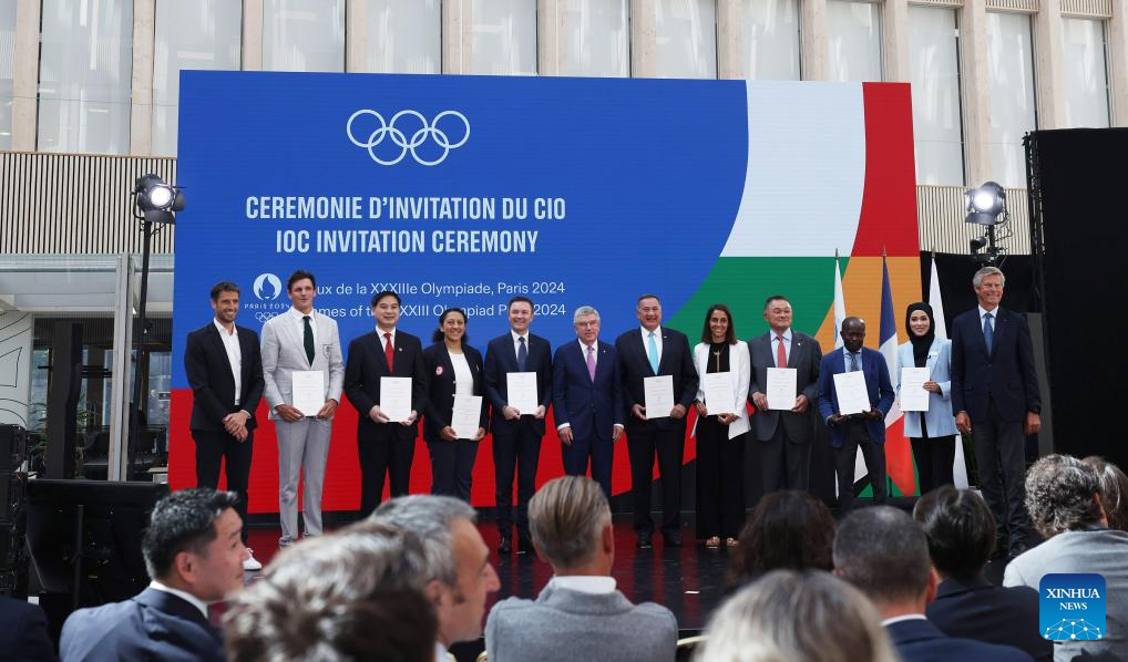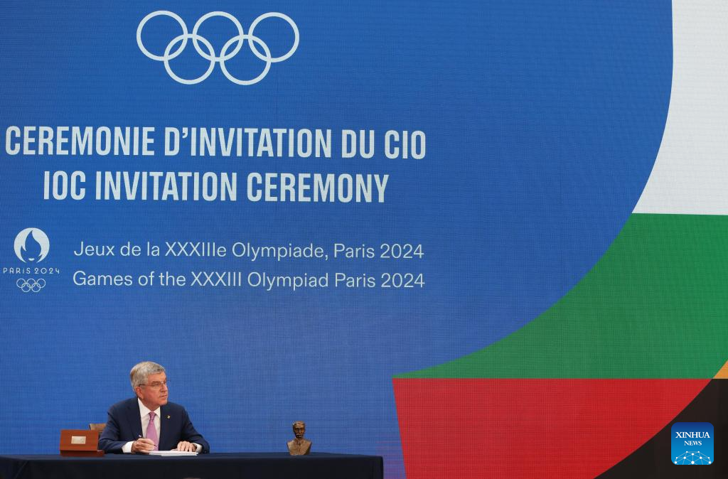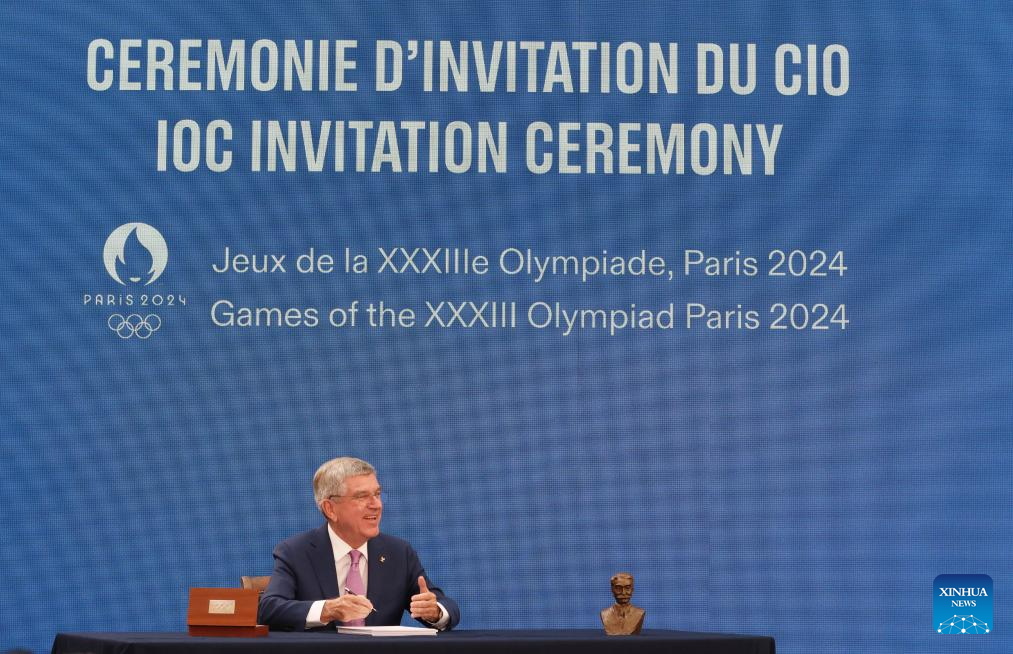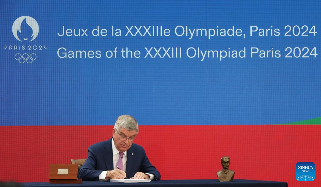 President of the International Olympic Committee (IOC) Thomas Bach signs the invitations during a ceremony marking one year until the opening ceremony of the Paris Olympics in Saint-Denis, near Paris, France, July 26, 2023. (Xinhua/Gao Jing)