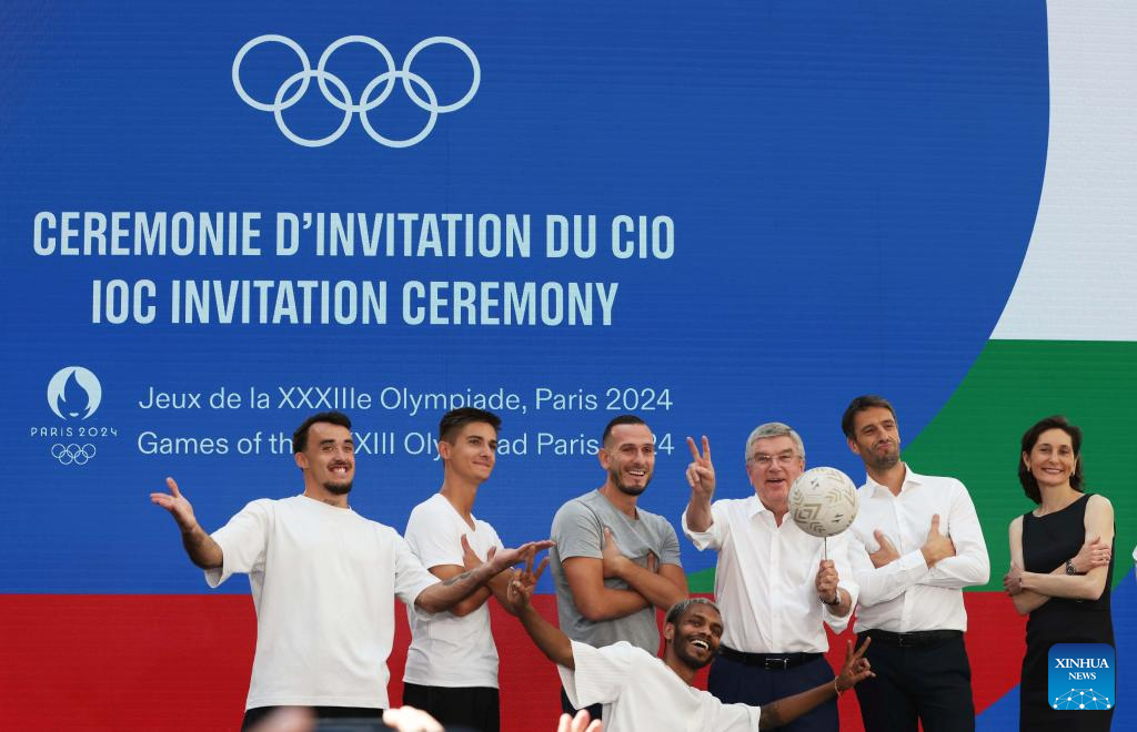President of the International Olympic Committee (IOC) Thomas Bach (3rd R), President of the Paris 2024 Organising Committee Tony Estanguet (2nd R) and French Sports Minister Amelie Oudea-Castera (1st R) pose with dancers during a ceremony marking one year until the opening ceremony of the Paris Olympics in Saint-Denis, near Paris, France, July 26, 2023. (Xinhua/Gao Jing)