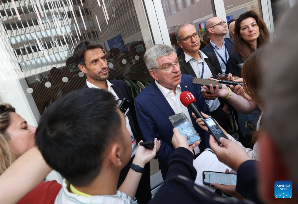 Thomas Bach, President of International Olympic Committee (IOC), gets interviewed after a ceremony marking one year until the opening ceremony of the Paris Olympics in Saint-Denis, near Paris, France, July 26, 2023. (Xinhua/Gao Jing)