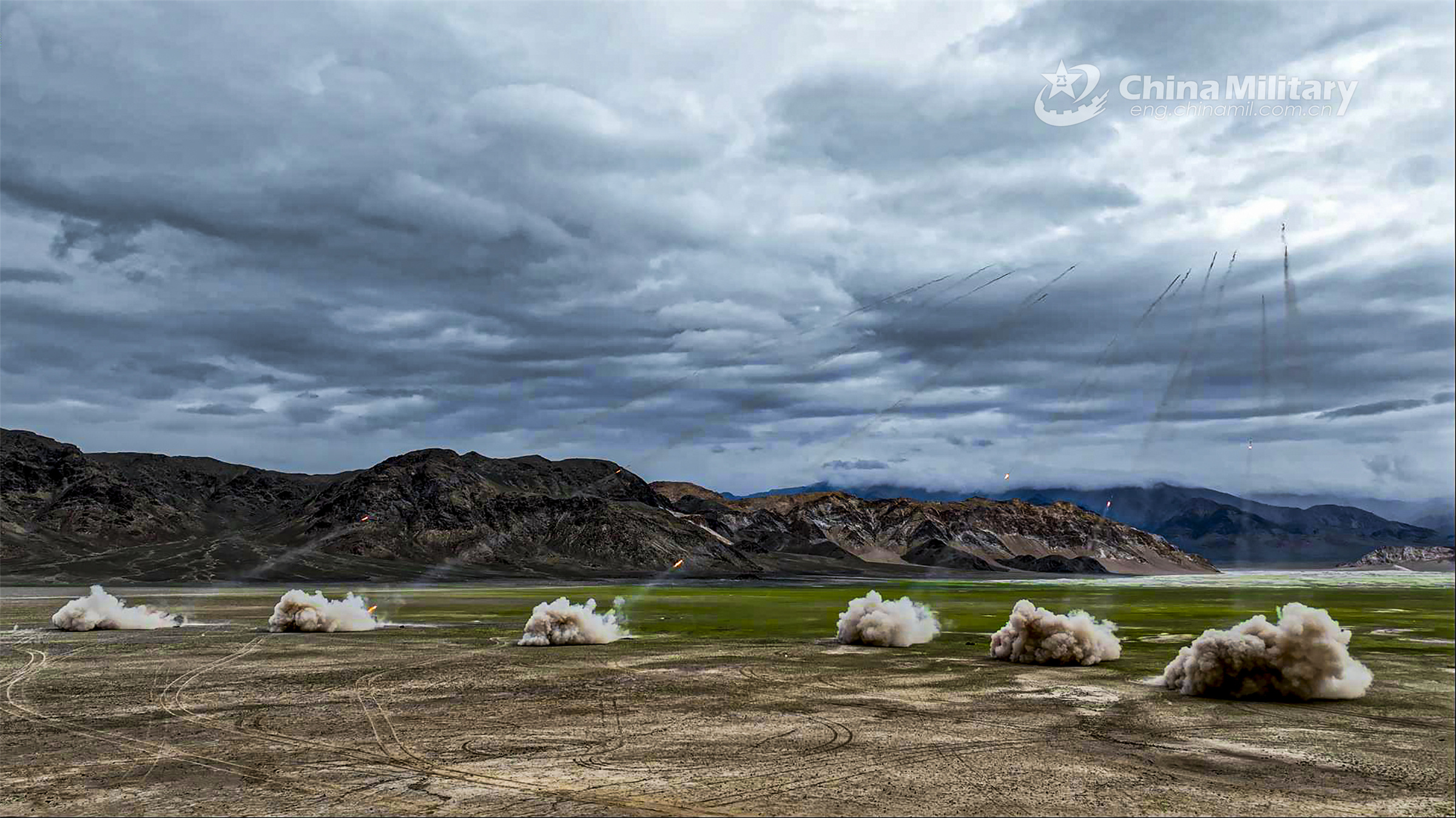 Vehicle-mounted rocket launchers attached to a unit of the PLA army fire at mock targets during a live-fire training exercise on July 13, 2023. (eng.chinamil.com.cn/Photo by Shang Luhang)