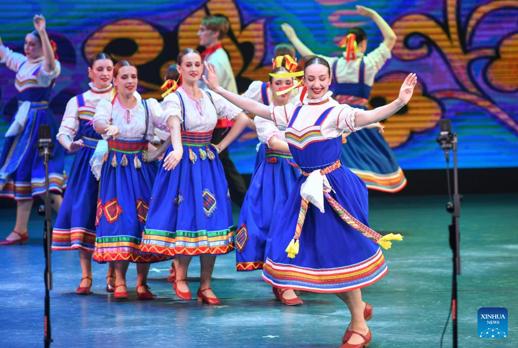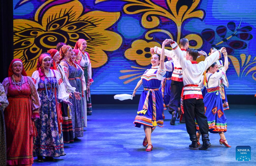 Sofia (front) performs with her colleagues at a theater in Urumqi, capital of northwest China's Xinjiang Uygur Autonomous Region, on July 22, 2023. (Xinhua/Hu Huhu)