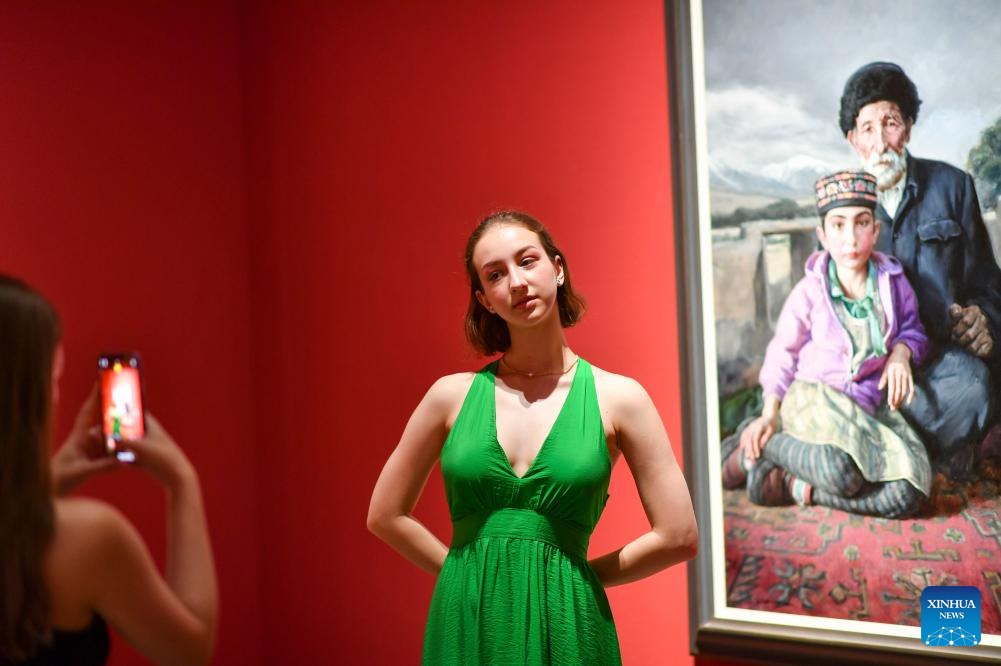 Sofia poses for photos in front of a painting at the Xinjiang Art Museum in Urumqi, capital of northwest China's Xinjiang Uygur Autonomous Region, on July 20, 2023. (Xinhua/Hu Huhu)
