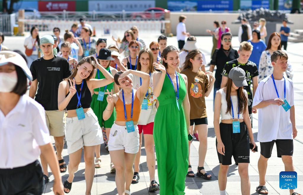 Sofia (C) learns paper-cutting at the Xinjiang Library in Urumqi, capital of northwest China's Xinjiang Uygur Autonomous Region, on July 23, 2023. (Xinhua/Hu Huhu)