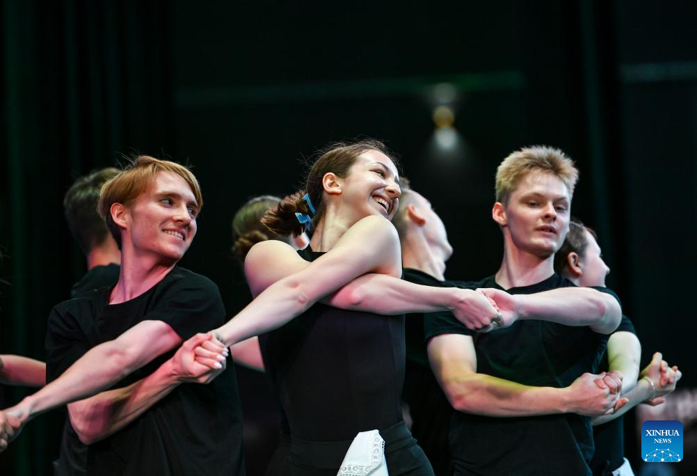 Sofia (C) rehearses with her colleagues at a theater in Urumqi, capital of northwest China's Xinjiang Uygur Autonomous Region, on July 21, 2023. (Xinhua/Hu Huhu)