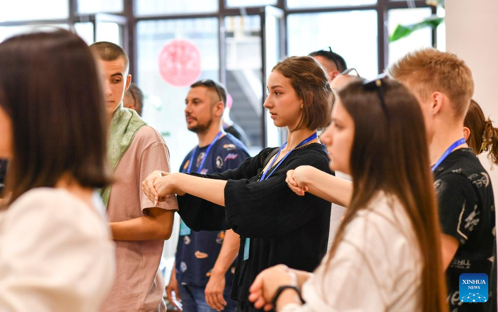 Sofia (C) and her colleagues learn a gesture of traditional Chinese salute at the Xinjiang Library in Urumqi, capital of northwest China's Xinjiang Uygur Autonomous Region, on July 23, 2023. (Xinhua/Hu Huhu)