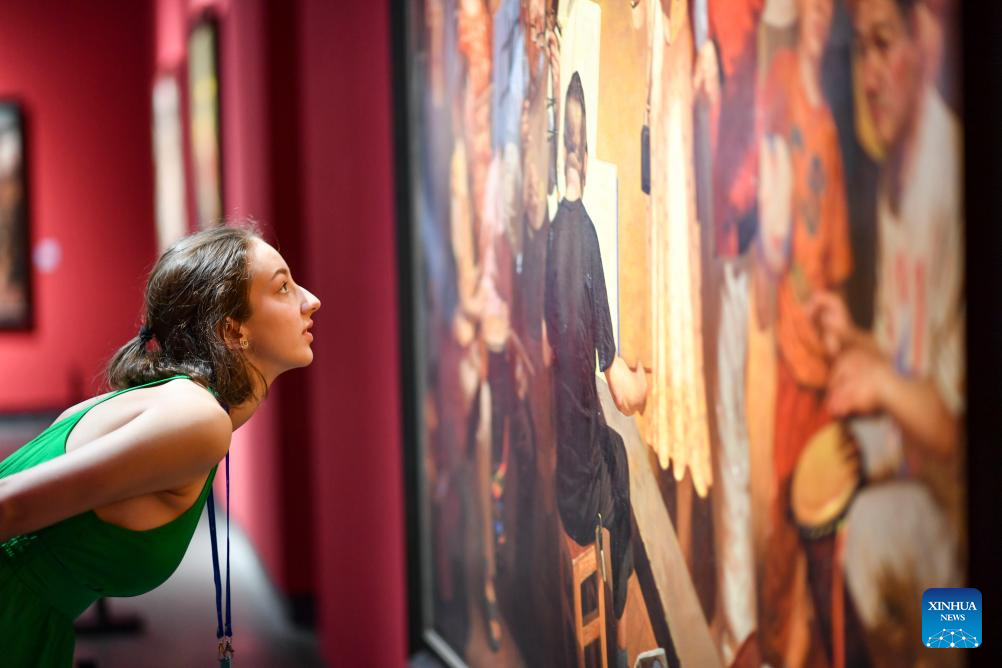 Sofia views a painting at the Xinjiang Art Museum in Urumqi, capital of northwest China's Xinjiang Uygur Autonomous Region, on July 20, 2023. (Xinhua/Hu Huhu)