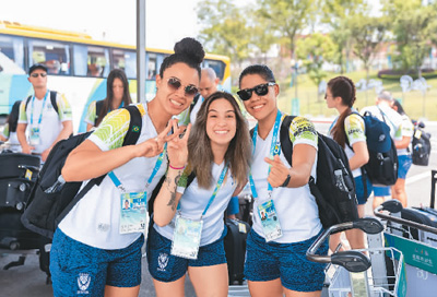Members of the Brazilian delegation pose for a picture after arriving at the FISU World University Games Village in Chengdu, southwest China's Sichuan Province. The FISU World University Games Village in Chengdu officially opened its doors to athletes and team officials on July 22. (Xinhua/Huang Wei)