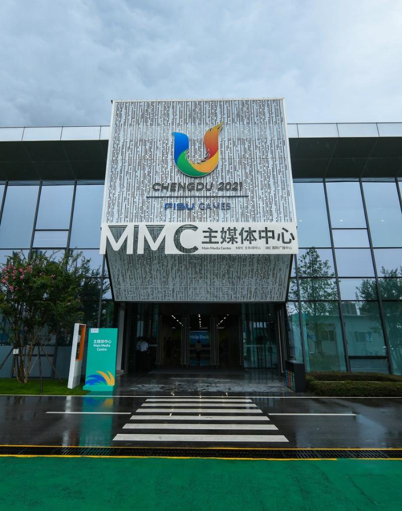 Photo taken on July 13, 2023 shows an exterior view of the Main Media Center for the 31st FISU Summer World University Games in Chengdu, capital of southwest China's Sichuan Province. (Xinhua/Wang Xi)