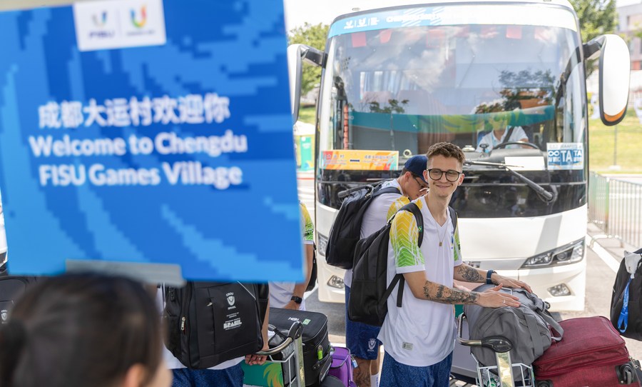 Team Brazil arrive at the FISU Games Village in Chengdu, southwest China's Sichuan Province, July 22, 2023. The 31st International University Sports Federation (FISU) Summer World University Games will be held in Chengdu from July 28 to August 8. (Xinhua/Huang Wei)
