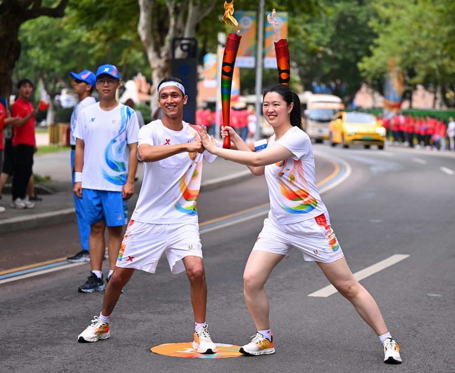 Torch bearers Zheng Rui (R) from China and Zahidul Alam from Bangladesh pose during the torch relay of the 31st FISU Summer World University Games in Chengdu, southwest China's Sichuan Province, July 26, 2023. (Xinhua/Chen Zeguo)