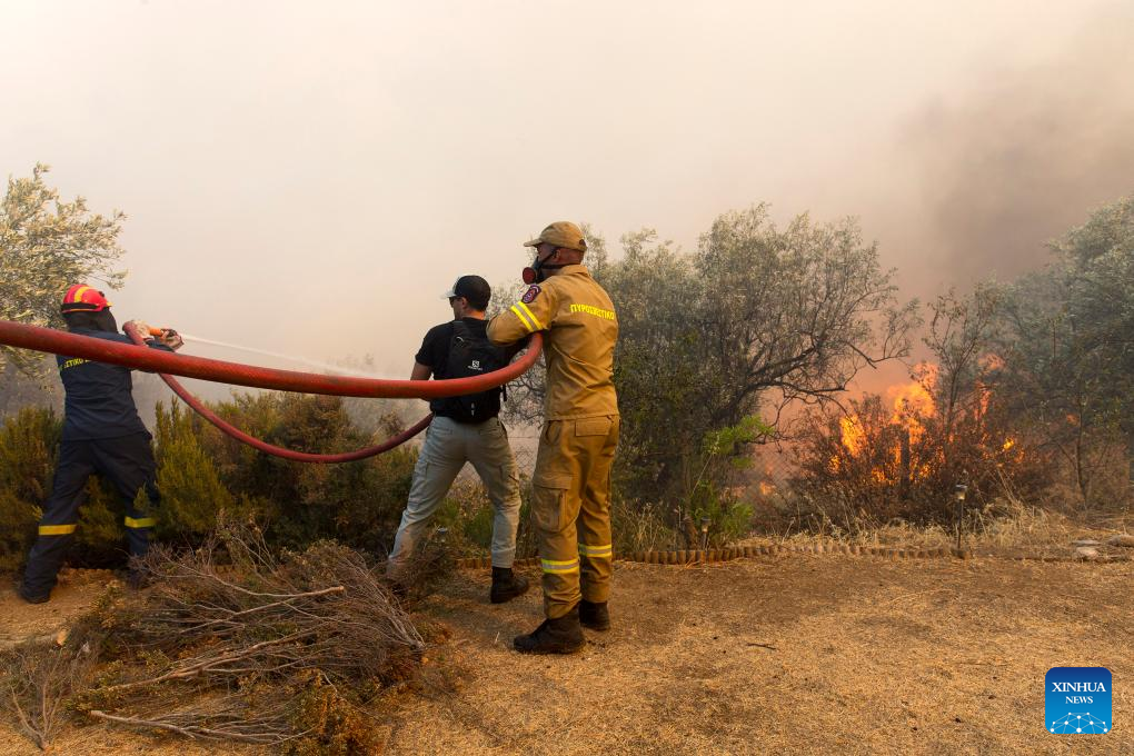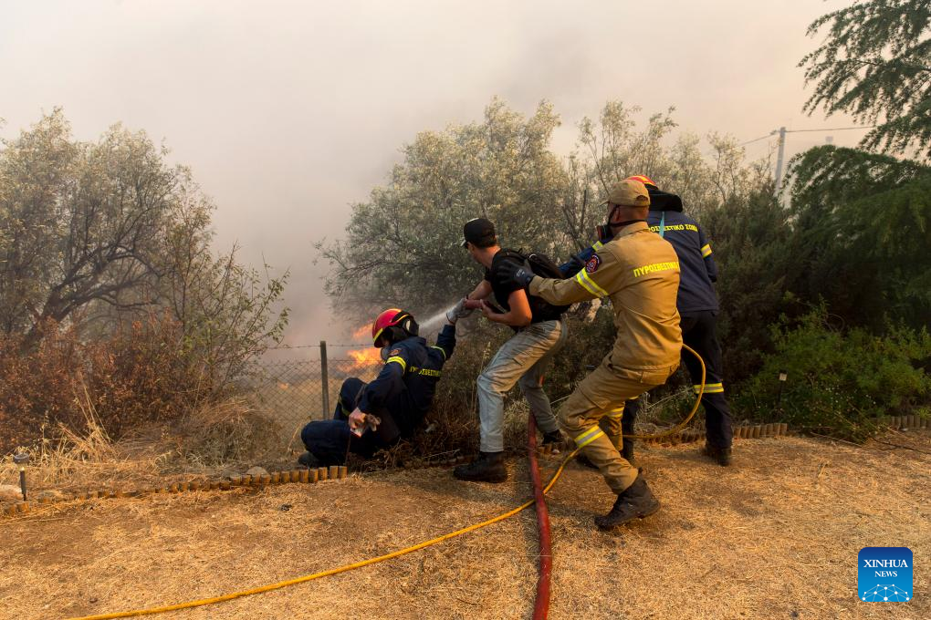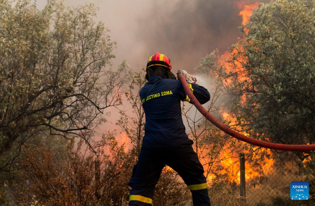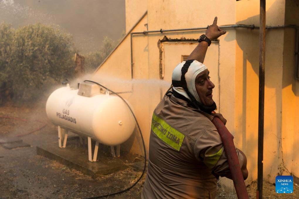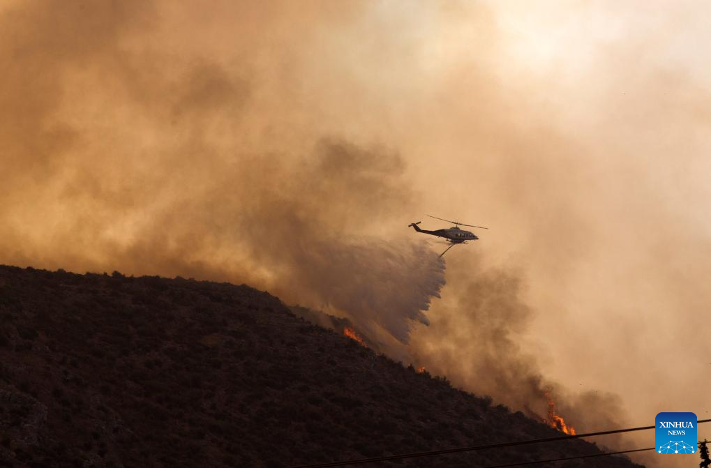 ATHENS, July 27 (Xinhua) -- Wildfires raging across parts of Greece has forced the evacuation of an air force base at the seaside town of Nea Anchialos, near the port city of Volos, as well as 12 settlements in the area, Greek national news agency AMNA reported on Thursday.