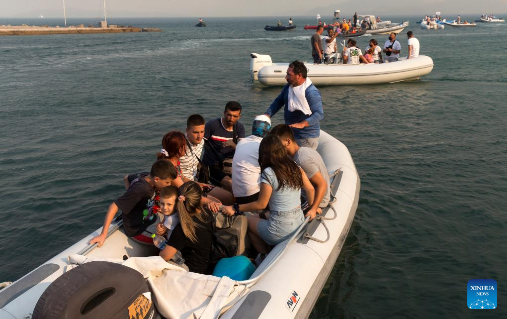 Residents and visitors are evacuated as a wildfire rages in Nea Anchialos town, Volos, Greece, on July 27, 2023. Wildfires raging across parts of Greece has forced the evacuation of an air force base at the seaside town of Nea Anchialos, near the port city of Volos, as well as 12 settlements in the area, Greek national news agency AMNA reported on Thursday. (Xinhua/Marios Lolos)