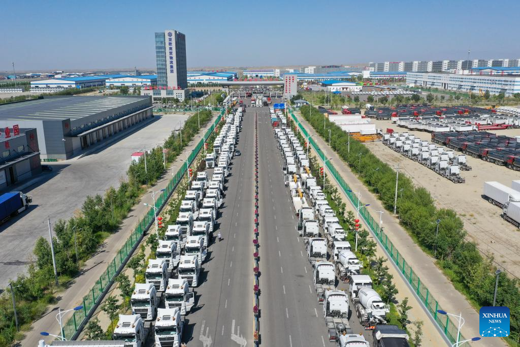 This aerial photo taken on July 26, 2023 shows domestically-made vehicles at the Horgos comprehensive bonded area in northwest China's Xinjiang Uygur Autonomous Region.?(Xinhua/Ding Lei)