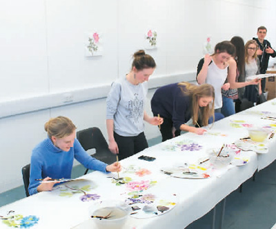 College students in the U.K. paint peony flowers on a 100-meter-long scroll. (Photo courtesy of the interviewee)