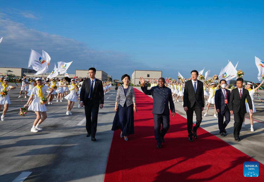 A welcoming ceremony is held upon the arrival of Burundian President Evariste Ndayishimiye in Chengdu, capital of southwest China's Sichuan Province, July 28, 2023. Ndayishimiye on Friday arrived in Chengdu to attend the opening ceremony of the 31st summer edition of the FISU World University Games and visit China. (Xinhua/Jiang Hongjing)