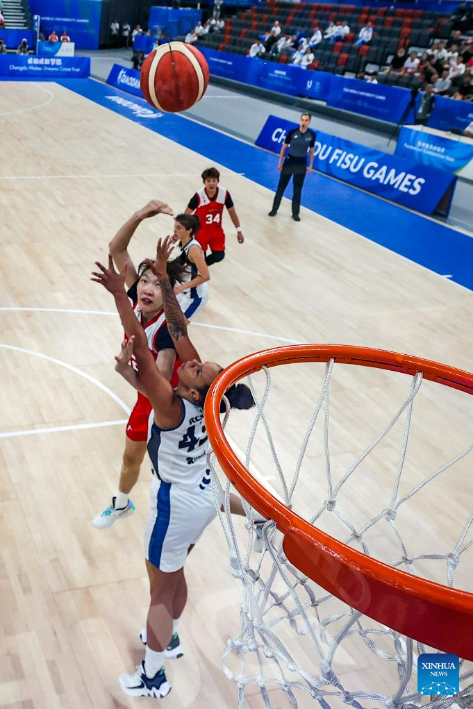 Li Yifan (R) of China defends during the women's basketball preliminary round group D match between China and Portugal at the 31st FISU Summer World University Games in Chengdu, southwest China's Sichuan Province, July 28, 2023. (Xinhua/Hu Chao)