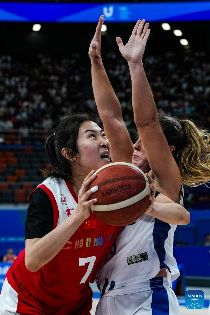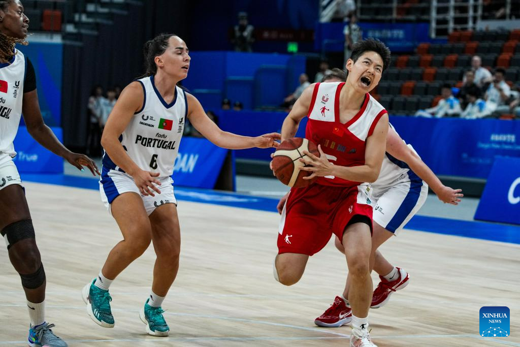 Li Yifan (L) of China competes during the women's basketball preliminary round group D match between China and Portugal at the 31st FISU Summer World University Games in Chengdu, southwest China's Sichuan Province, July 28, 2023. (Xinhua/Hu Chao)