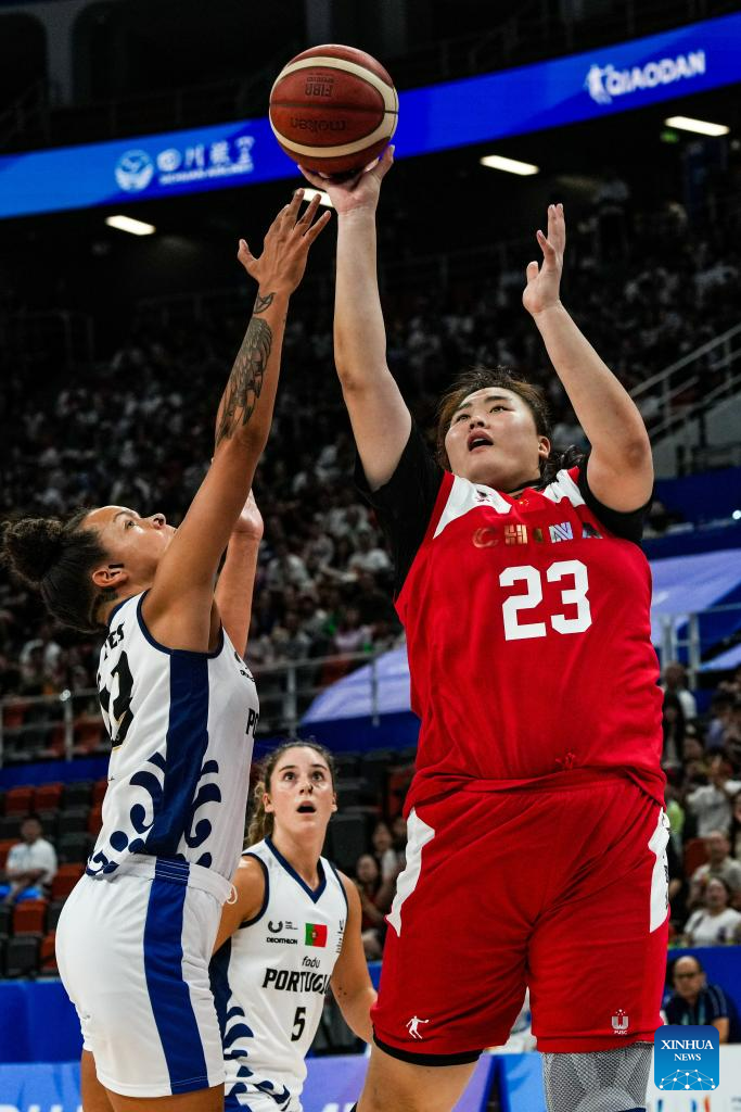 Han Xu (1st L) of China shoots during the women's basketball preliminary round group D match between China and Portugal at the 31st FISU Summer World University Games in Chengdu, southwest China's Sichuan Province, July 28, 2023. (Xinhua/Hu Chao)
