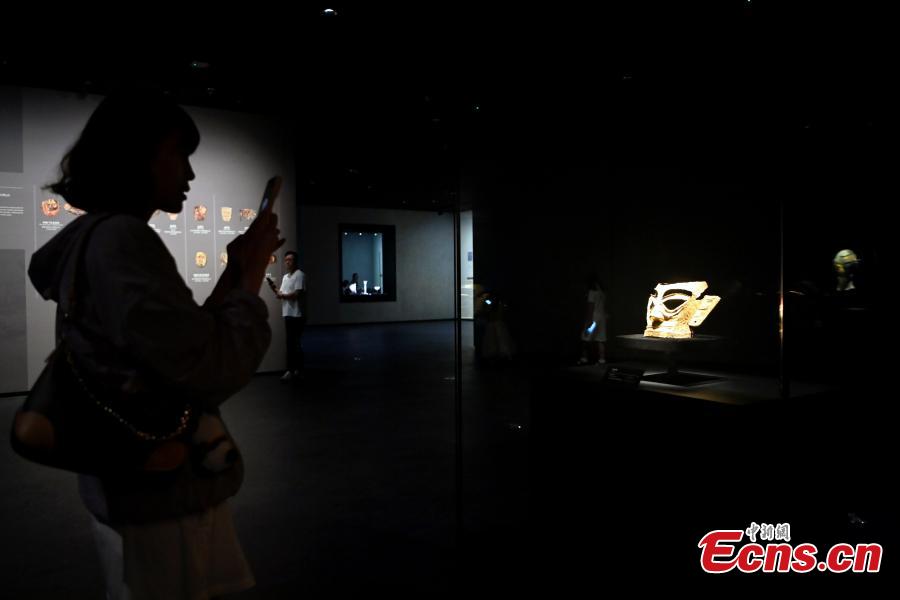 A visitor takes photos of a golden mask exhibited at the new building of the Sanxingdui Museum in Guanghan, southwest China's Sichuan Province, July 27, 2023. (Photo: China News Service/An Yuan)