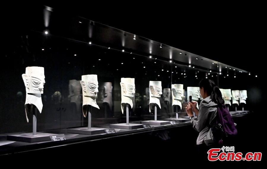 Visitors view cultural relics exhibited at the new building of the Sanxingdui Museum in Guanghan, southwest China's Sichuan Province, July 27, 2023. (Photo: China News Service/An Yuan)