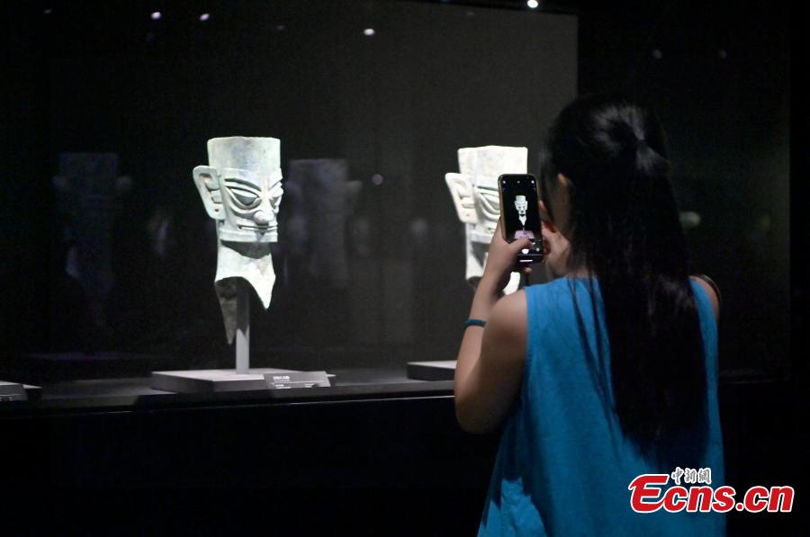 A visitor takes photos of bronze heads exhibited at the new building of the Sanxingdui Museum in Guanghan, southwest China's Sichuan Province, July 27, 2023. (Photo: China News Service/An Yuan)