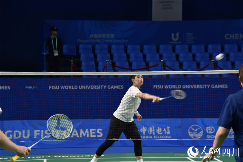 Chinese badminton players prepare for the 31st International University Sports Federation (FISU) Summer World University Games held in Chengdu, southwest China's Sichuan Province. (People's Daily Online/Chen Xue)