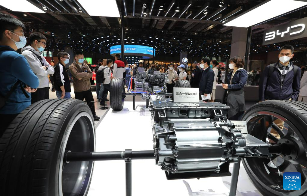 People visit the exhibition area of BYD during the 20th Shanghai International Automobile Industry Exhibition in Shanghai, east China, April 24, 2023. The Yangtze River Economic Belt is an important gathering place for the automobile industry, bringing together a large number of automobile brands and manufacturers, which helps China's new energy vehicle industry move to a new stage of large-scale and global development, and also adds new impetus to the high-quality development of the Yangtze River Economic Belt. (Xinhua/Fang Zhe)