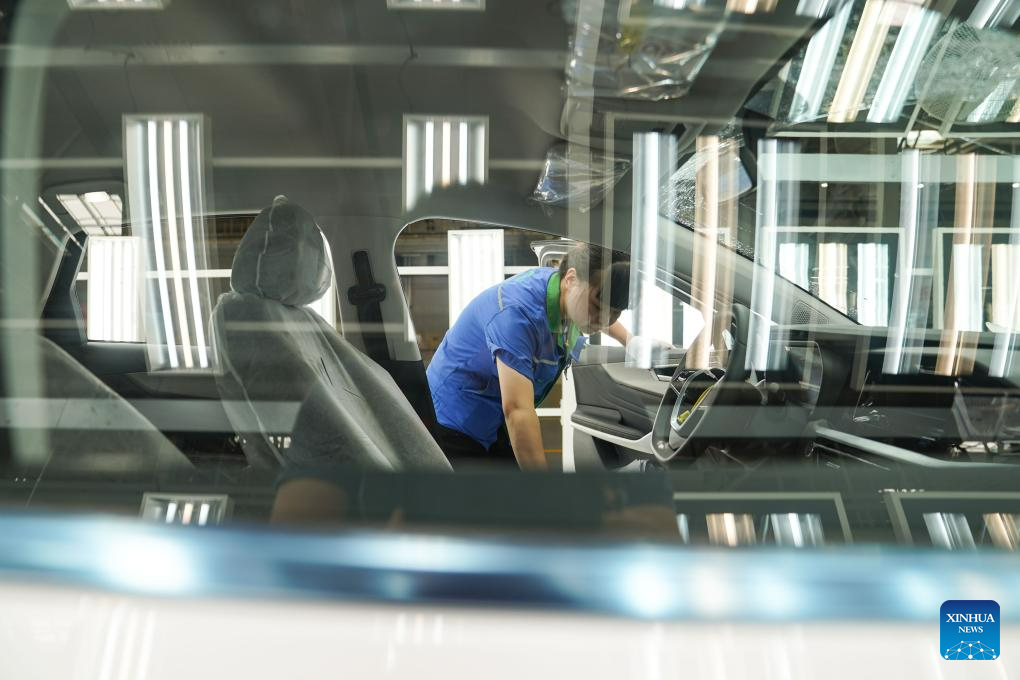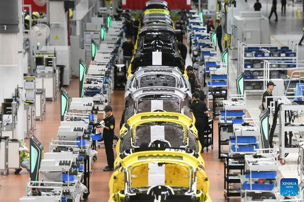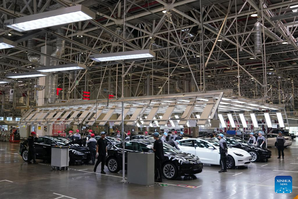 Workers work at the Tesla Gigafactory in Shanghai, east China, May 12, 2023. The Yangtze River Economic Belt is an important gathering place for the automobile industry, bringing together a large number of automobile brands and manufacturers, which helps China's new energy vehicle industry move to a new stage of large-scale and global development, and also adds new impetus to the high-quality development of the Yangtze River Economic Belt. (Xinhua/Ma Ning)