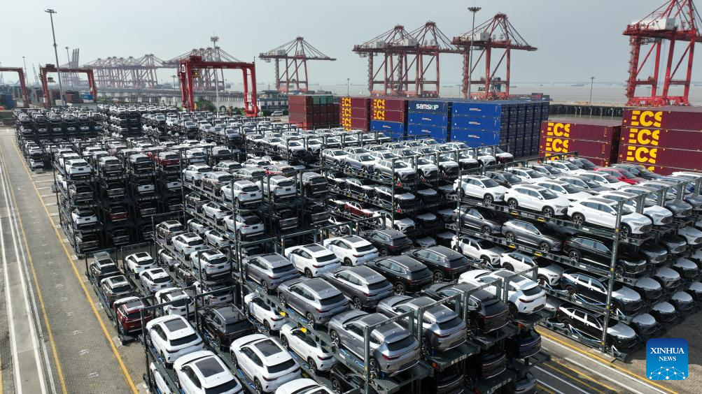 This aerial photo taken on July 11, 2023 shows new energy vehicles for export at a terminal of Taicang Port, east China's Jiangsu Province. The Yangtze River Economic Belt is an important gathering place for the automobile industry, bringing together a large number of automobile brands and manufacturers, which helps China's new energy vehicle industry move to a new stage of large-scale and global development, and also adds new impetus to the high-quality development of the Yangtze River Economic Belt. (Photo by Ji Haixin/Xinhua)