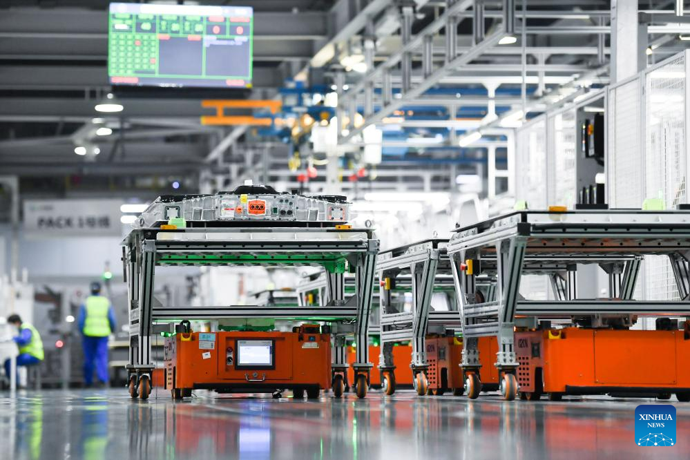 A transport vehicle delivers the installed power battery system parts at a workshop of SAIC-CATL Motor Power Battery System Co., Ltd. in Changzhou, east China's Jiangsu Province, Feb. 16, 2023. The Yangtze River Economic Belt is an important gathering place for the automobile industry, bringing together a large number of automobile brands and manufacturers, which helps China's new energy vehicle industry move to a new stage of large-scale and global development, and also adds new impetus to the high-quality development of the Yangtze River Economic Belt. (Xinhua/Li Bo)