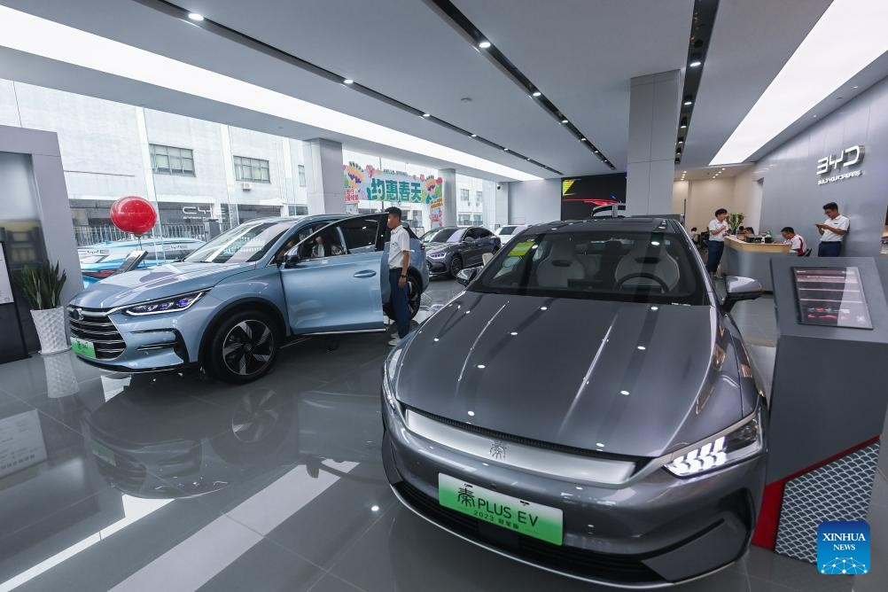New energy vehicles are on display at a BYD exhibition hall in Fuyang District of Hangzhou, east China's Zhejiang Province, July 18, 2023. The Yangtze River Economic Belt is an important gathering place for the automobile industry, bringing together a large number of automobile brands and manufacturers, which helps China's new energy vehicle industry move to a new stage of large-scale and global development, and also adds new impetus to the high-quality development of the Yangtze River Economic Belt. (Xinhua/Xu Yu)