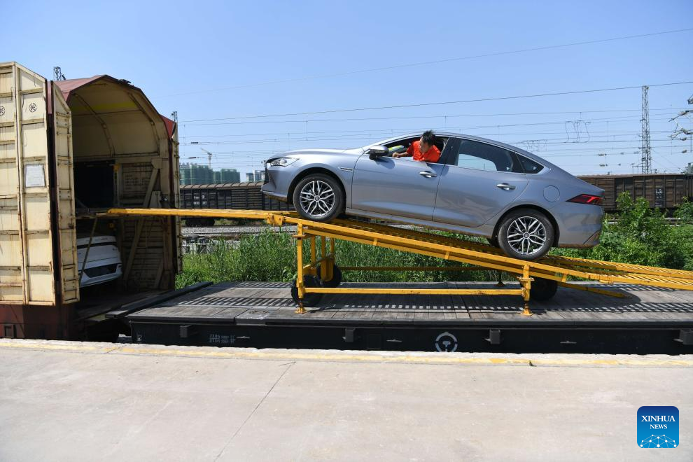 A worker loads a new-energy vehicle onto a train at the Shuijiahu railway freight station in Changfeng County of Hefei, east China's Anhui Province, May 9, 2023. The Yangtze River Economic Belt is an important gathering place for the automobile industry, bringing together a large number of automobile brands and manufacturers, which helps China's new energy vehicle industry move to a new stage of large-scale and global development, and also adds new impetus to the high-quality development of the Yangtze River Economic Belt. (Xinhua/Liu Junxi)