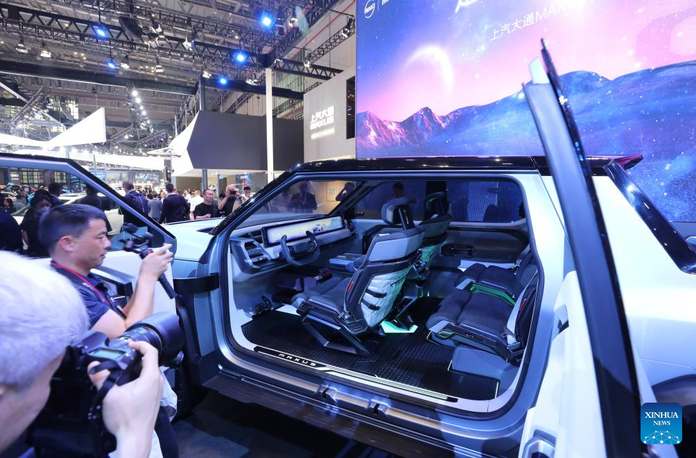 People visit the exhibition area of SAIC Motor Co., Ltd. during the 20th Shanghai International Automobile Industry Exhibition in Shanghai, east China, April 18, 2023. The Yangtze River Economic Belt is an important gathering place for the automobile industry, bringing together a large number of automobile brands and manufacturers, which helps China's new energy vehicle industry move to a new stage of large-scale and global development, and also adds new impetus to the high-quality development of the Yangtze River Economic Belt. (Xinhua/Fang Zhe)