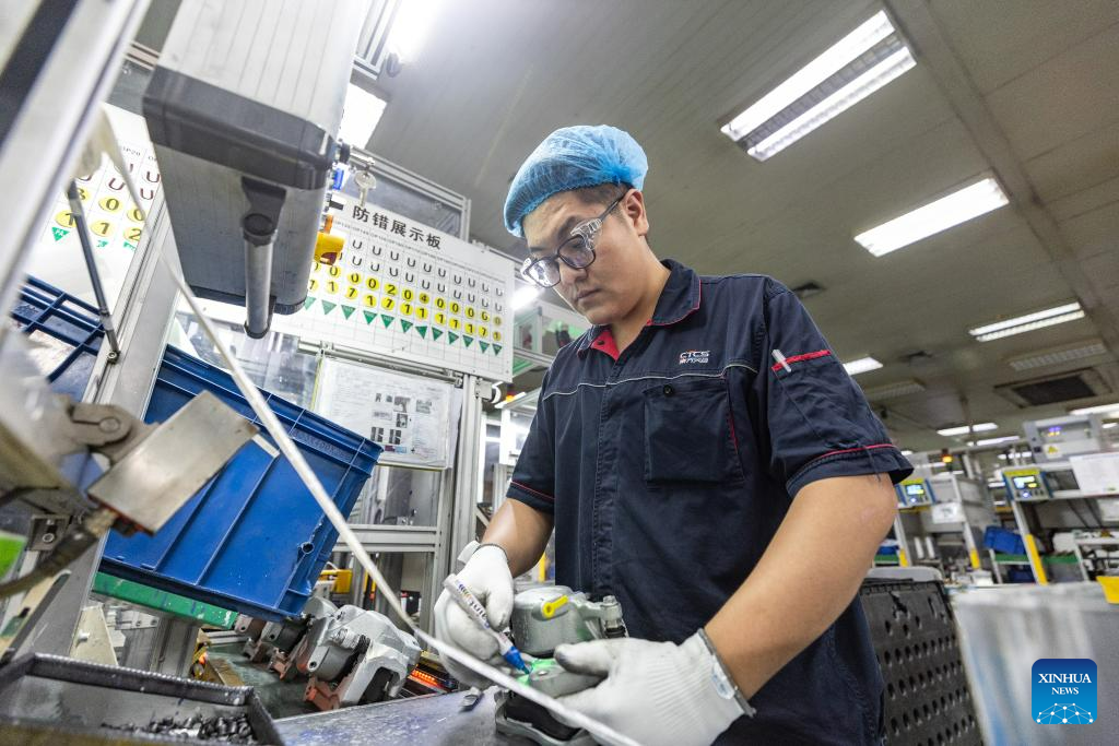 A worker operates equipment at a workshop of a chassis system company in southwest China's Chongqing, July 13, 2023. The Yangtze River Economic Belt is an important gathering place for the automobile industry, bringing together a large number of automobile brands and manufacturers, which helps China's new energy vehicle industry move to a new stage of large-scale and global development, and also adds new impetus to the high-quality development of the Yangtze River Economic Belt. (Xinhua/Huang Wei)
