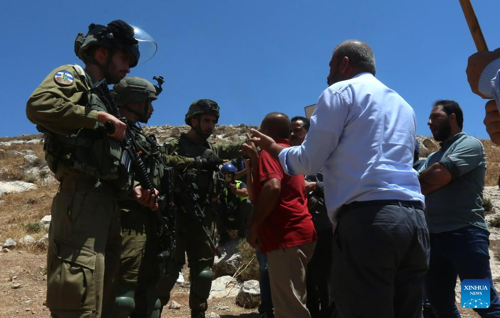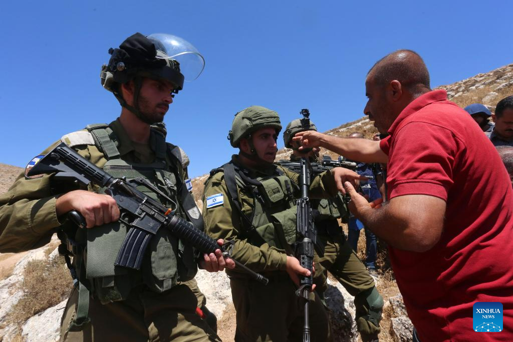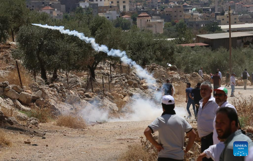 An Israeli soldier fires a tear gas canister at Palestinian protesters during clashes following a protest against the expansion of Jewish settlements in the West Bank village of Beit Dajan, east of Nablus, on July 28, 2023. (Photo by Nidal Eshtayeh/Xinhua)