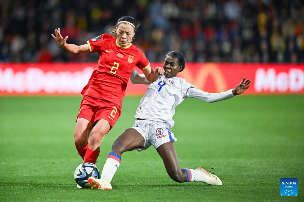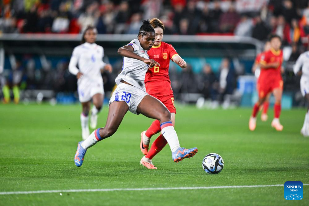 Yao Wei (3rd L) China vies with Melchie Dumonay of Haiti during the group D match at the 2023 FIFA Women's World Cup in Adelaide, Australia, July 28, 2023. (Xinhua/Li Yibo)