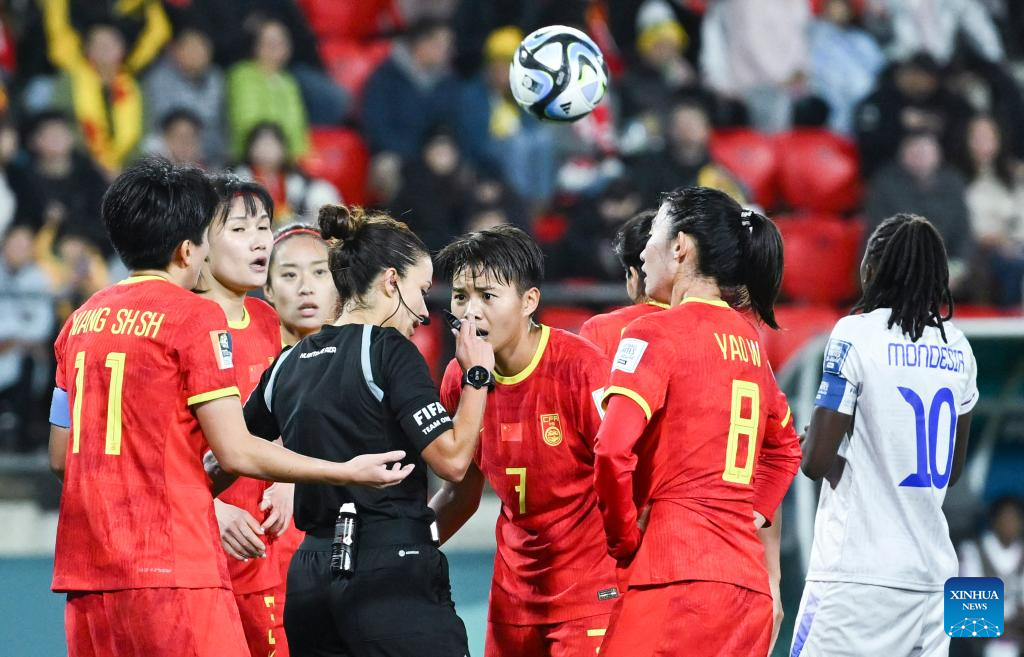 Wang Shuang (C) China argues with referee during the group D match between China and Haiti at the 2023 FIFA Women's World Cup in Adelaide, Australia, July 28, 2023. (Xinhua/Li Yibo)