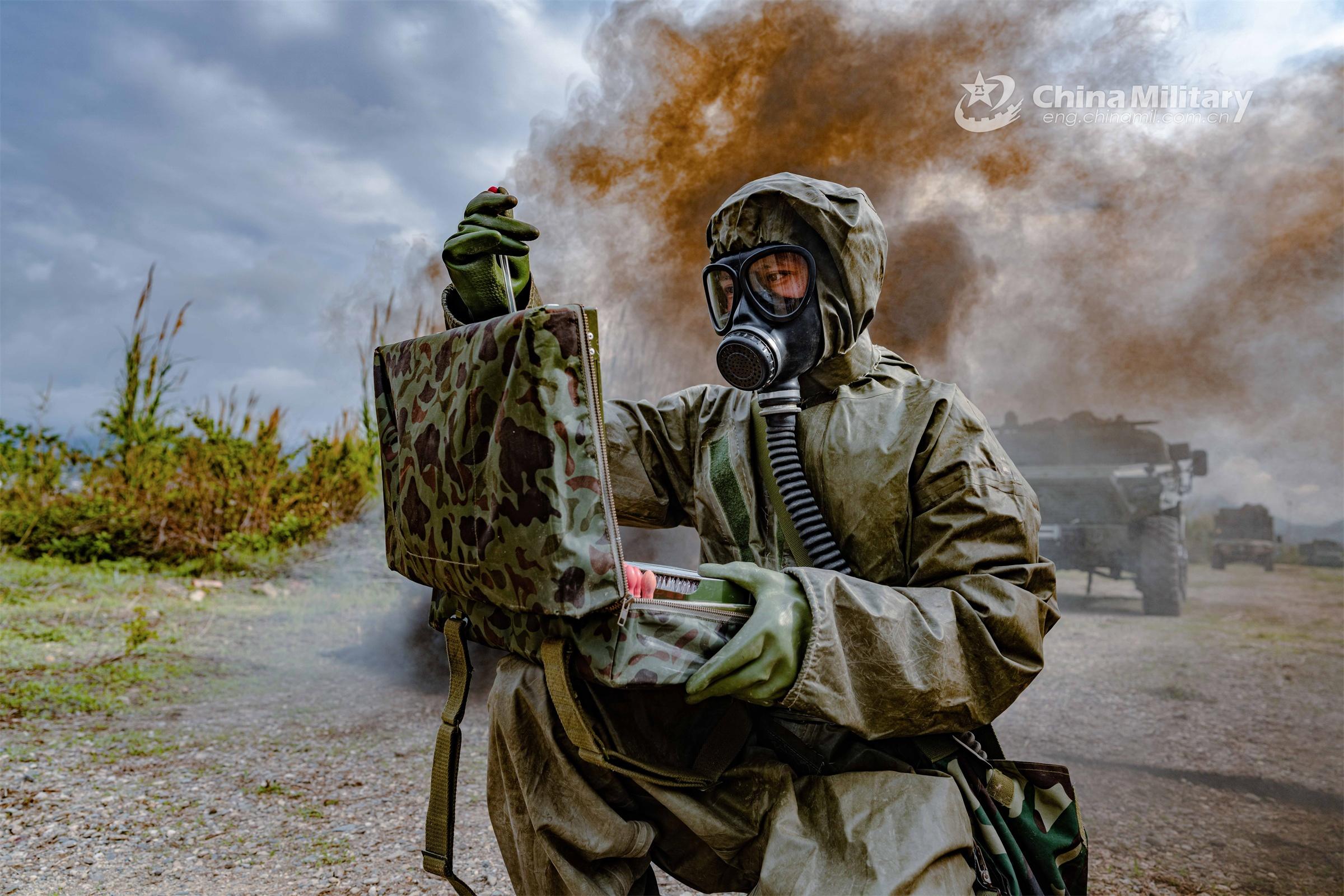 A soldier assigned to a chemical defense element of a brigade under the PLA 75th Group Army tests a contamination sample during a comprehensive chemical training exercise on July 12, 2023. (eng.chinamil.com.cn/Photo by Teng Zhaoseng)