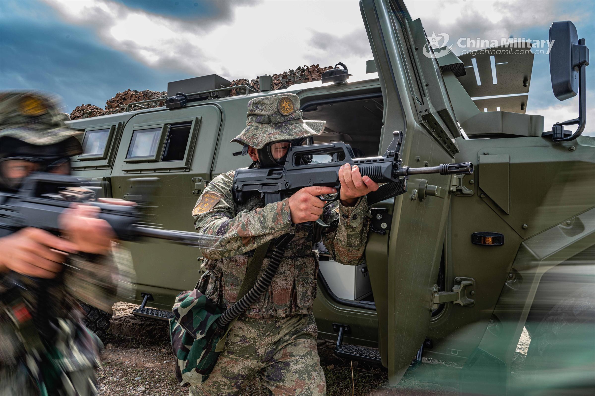 Soldiers assigned to a chemical defense element of a brigade under the PLA 75th Group Army provide cover for their fellows during a comprehensive chemical training exercise on July 12, 2023. (eng.chinamil.com.cn/Photo by Teng Zhaoseng)